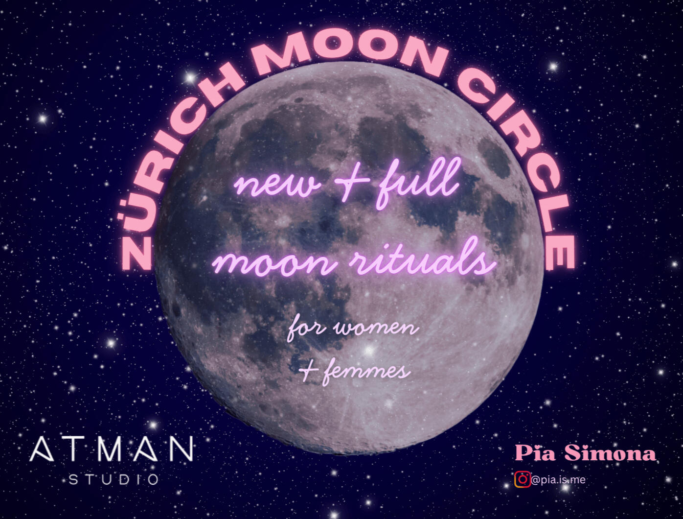A monthly gathering for women and femmes who want real connection -with themselves, with others, and with the living rhythms that, in their way, shape our bodies, our experiences, and the world around us.This is for the spiritually curious, the spiritually fatigued, or for anybody who is tired of chasing the next promise of transformation. If you want something grounded, cyclical, and honest, this space is for you.The world is on fire right now - literally and metaphorically - and so much feels out of our control. I'm not here to bypass that. But tending to ourselves isn't checking out; it's how we build the capacity to stay present and keep showing up. In a city like Zürich, where loneliness is real and building genuine connection can feel nearly impossible, having a space to land with people who get it - without having to explain yourself first - matters more than ever.No two circles are the same. Each gathering is guided by the energy in the room, what's true for us in the present moment, and the astrology of the lunation: the sign the Moon is transiting, the energy it brings, the themes it highlights, and the portals to self inquiry and curiosity it unlocks. There's no pressure to perform, nothing to make palatable, no need to be anything but yourself.Some nights we write, talk, or journal; other times we move, dance, play, rest, or drop into simple ritual - it's always shaped by the energy of the moment and the lunar cycle we're in.We meet under each New and Full Moon (every second Friday @ ATMAN Studio), working with its natural rhythm:New Moon: a time for beginnings, intention-setting, planting seeds (literally or metaphorically).